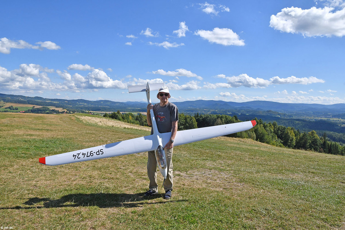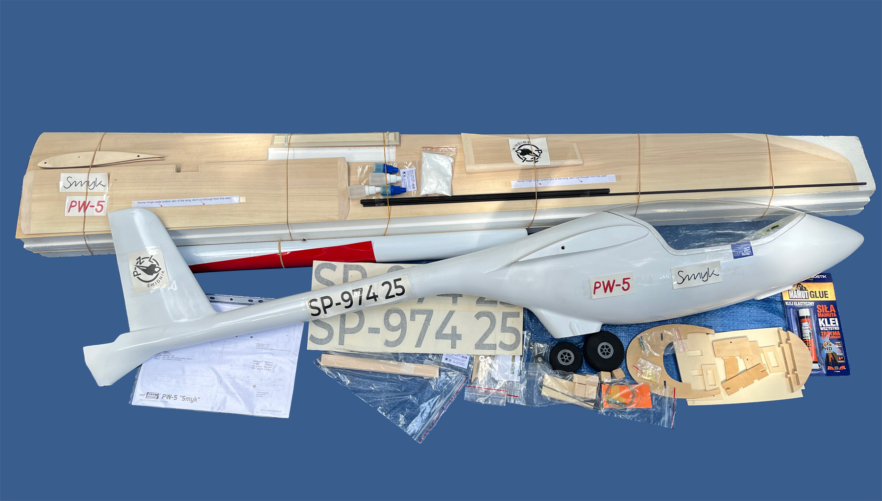 Offered here is a 1:3.9 scale model of the Polish PW-5 Smyk glider. The fuselage is made of fiberglass, and the wings are styrofoam sheeted with poplar veneer. It has a wingspan of 3.45 m and a length of 1.59 m. This makes the glider compact enough for transport, yet large enough to go thermal hunting at higher altitudes. The airfoil, specially designed for this model by aerodynamics expert Patryk Sokół (well known from more recent Art Hobby models), allows for dynamic flying while retaining thermal sensitivity. Basic aerobatics are also possible with the Smyk. Whether towed, slope-soaring, or powered by an electric motor, the model provides plenty of flying fun without overwhelming the pilot.