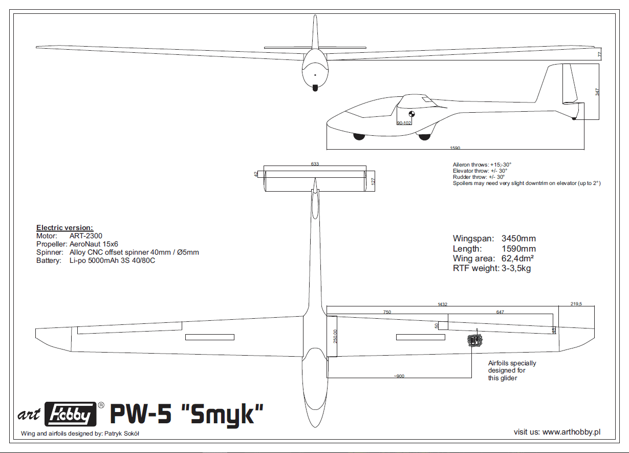 The take-off weight is around 3–3.5 kg depending on the equipment. Electrically, the Smyk can be powered by the Art Hobby ART 2300 motor and 3 LiPo cells with a capacity of 5000 mAh each.